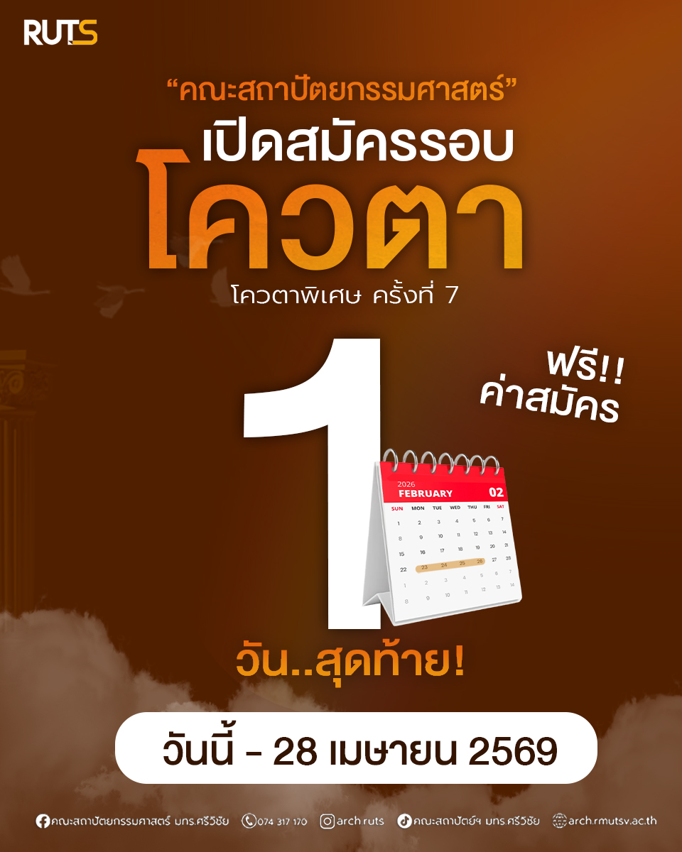 คณะสถาปัตยกรรมศาสตร์ มทร.ศรีวิชัย ขอเชิญชวนน้องๆ ที่มีความสนใจด้านการออกแบบและสถาปัตยกรรม สมัครเข้าศึกษาต่อในรอบโควตาพิเศษ ครั้งที่ 7